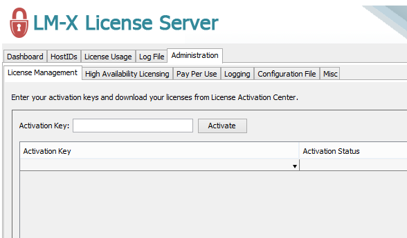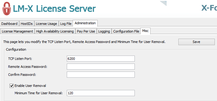 The server works as a Service and has to be started to be used. When the service is active, use the link LM-X License Service (Admin password – MyPassword123) to install or update network license keys and to change the default password, selecting the Administration tab and Misc tab. Then set the new password and save (you may be asked to restart the server).