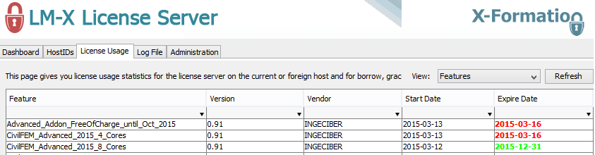 LM-X License Server has a web-based application, that needs Java installed, used to administer CivilFEM Licenses. It can be accessed by typing “localhost:6200” in a web browser or use the link provided in the start menu.