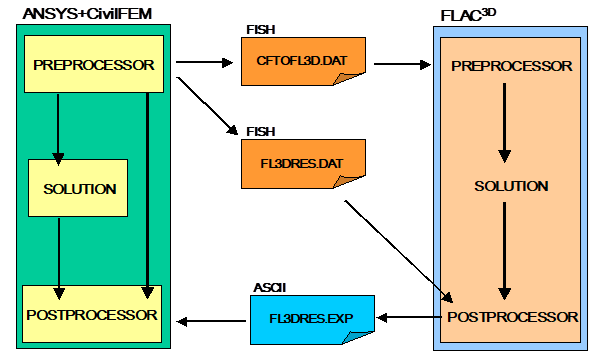 This connection is established at the preprocessing level, with the possibility of exporting CivilFEM’s model to FLAC3D (~CFFL3D command) and the postprocessing level by importing the structural element forces calculated by FLAC into CivilFEM (command ~FL3DRES). The following figure outlines the integration: