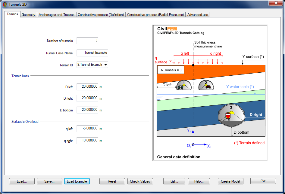 In this tab the user can specify the number of tunnels in the model, the ID of the model corresponding to the 2D tunnel section selected by the user, the terrain limits, and the load on the surface.