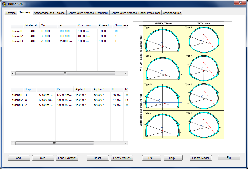 This utility assists the engineer in the design of 2D Tunnels and allows the user to create a catalogue of 2D tunnels.