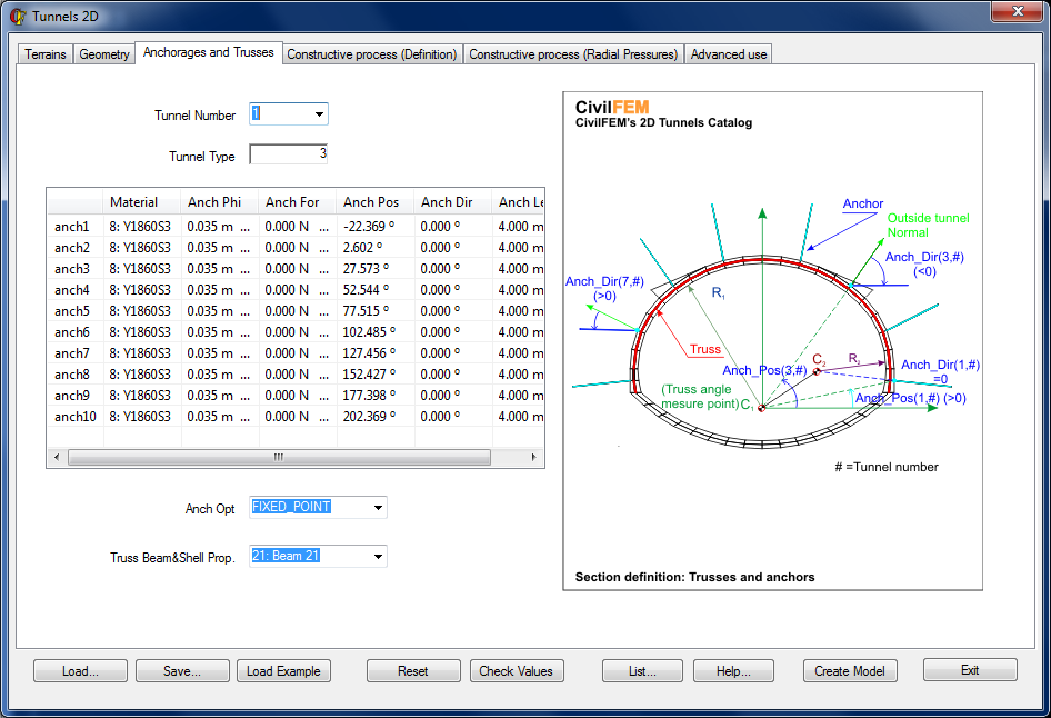 Anchors are defined through the angle between the horizontal axis at C1 (at the origin of the crown) and the initial point of the anchor. The direction of the anchor can be defined by specifying the deviation angle from the normal direction. This window will only be available if the number of anchors is greater than zero (Anchorages > 0 in the Geometry Window).
