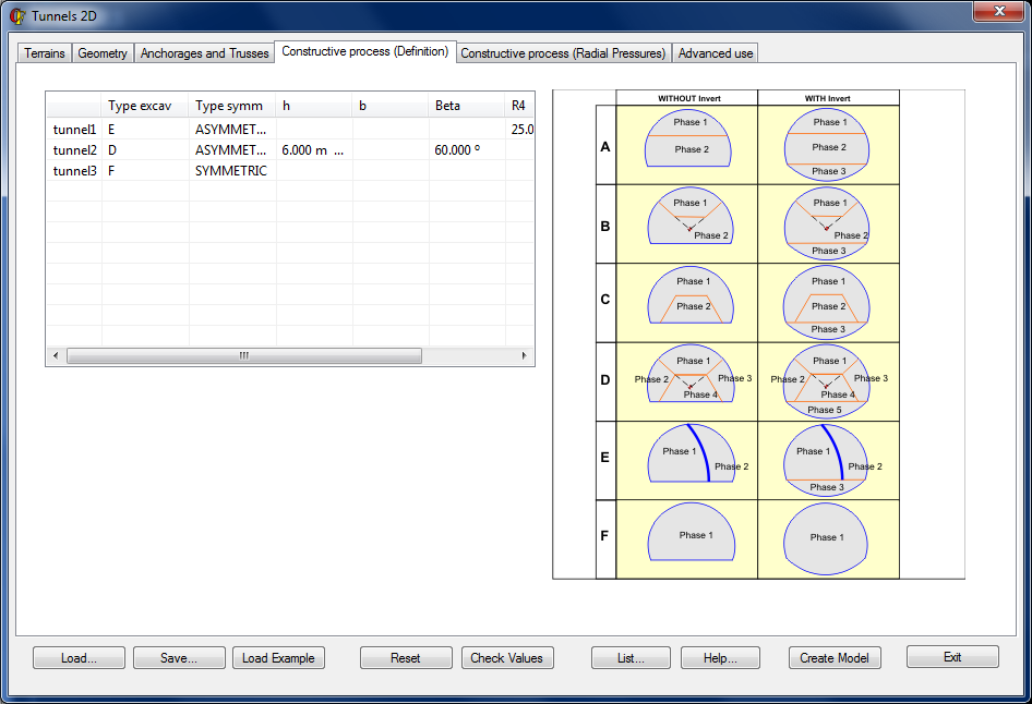 In this window, the user can identify the tunnel excavation method and define its corresponding parameters.