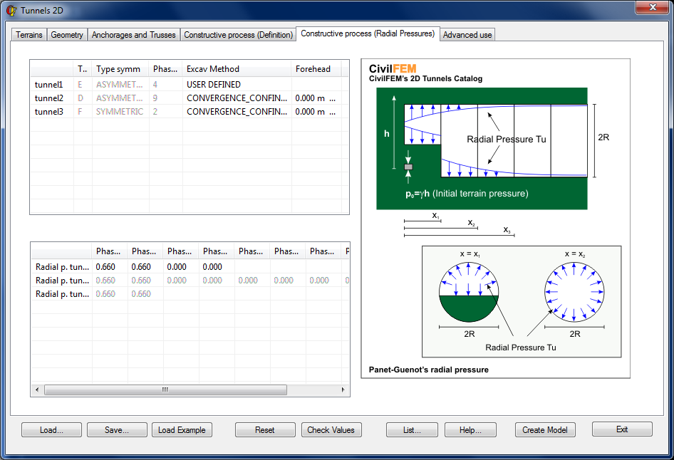This window contains data that will be necessary to define the lining pressures at the face of the excavation (for more information, consult the chapter 17-C Section 1.3.2 Constructive Process, in the 2D Tunnel section of the Theory Manual).