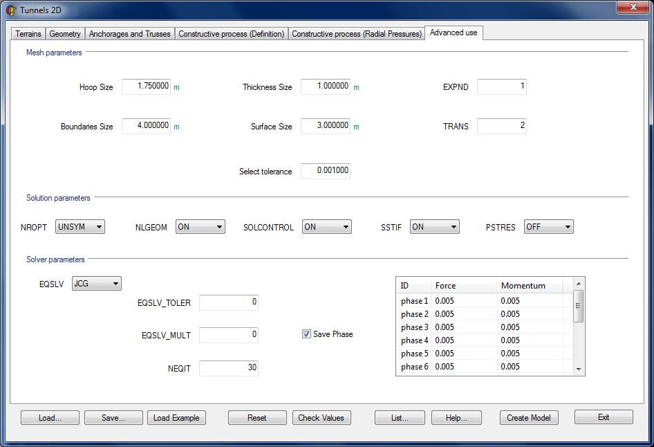 This window allows the user to modify the meshing parameters and model convergence options. The user may also save the geometry at particular phases of the calculation.