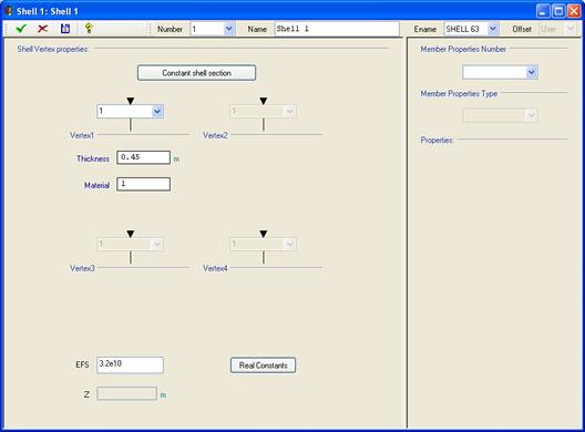 La siguiente ventana sirve para crear una Propiedad de Viga (Botón New Beam, comandos ~BMSHPRO y ~BMSHOFF) o de Placa (Botón New Shell, comando ~BMSHPRO), asà como para modificarlas (Botón Modify, comandos ~BMSHPRO y ~BMSHOFF), borrarlas (Botón Delete, comando ~BMSHDEL), copiarlas (Botón Copy, comando ~BMSHGEN), o listar sus propiedades (Botón List, comando ~BMSHLST).