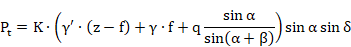 El empuje del terreno sobre la pantalla en un punto se calcula sumando la contribución de la columna de terreno sobre el punto, el término de cohesión y el término de carga superficial sobre el terreno. De esta manera se obtiene la siguiente expresión, válida para el caso de empuje activo y de empuje pasivo: