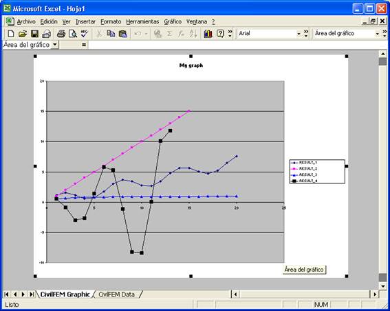 Esta ventana crea un gráfico y una tabla en Excel, a partir de vectores creados con Ansys o CivilFEM (ver comando ~VWXLS). El aspecto de la ventana es el siguiente: