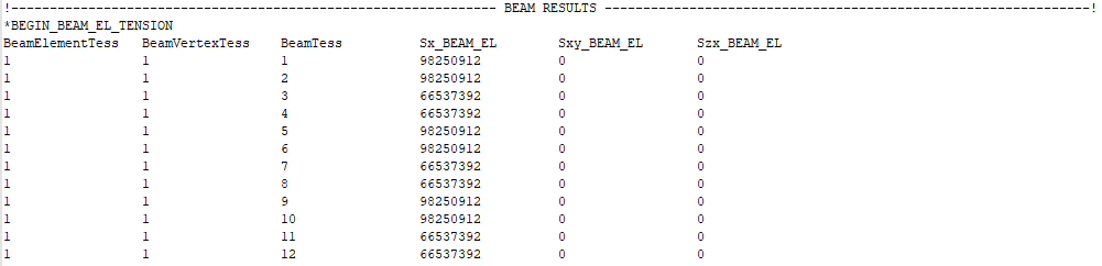 Once this model has been solved, a new .txt file has been performed. This file will contain the result information of this model. For instance, this .txt model should have written the stresses all along the beam structural element. Therefore if the .txt file is checked, this would be a little piece of information contained on it: