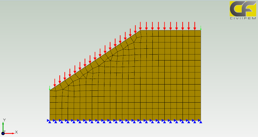 Once the Morh-Coulomb behavior has been established, the user has to define the different load states. For this example, loads into consideration will be a 0.2 Mp/m linear load along with the self weight effect; assigned on the top soil perimeter just as visualized in the previous image. For this purpose, only one load case would become necessary; nevertheless, in order to apply the SSRM analysis, CivilFEM requires the application of a second load case on which both loads and boundary conditions are the same than in the first load case. The difference falls into the activation of the SSRM analysis check box.
