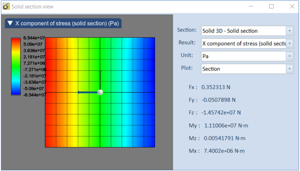 After establishing the load state and solving the model, in the results ribbon, concretely in the Solid Section part, two new options can be visualized: the plot and the list options.