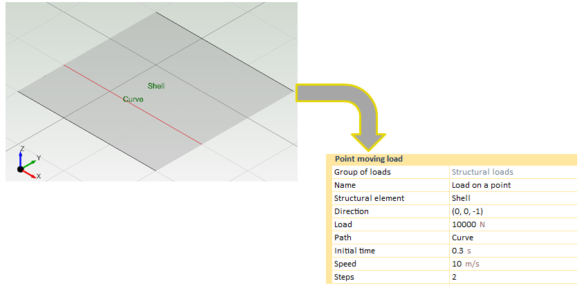 Apart from defining the direction and the load value, it is necessary to assign a path (line of application), the initial time in which the load starts acting, the speed at which the load goes along the structural element and the number of steps.