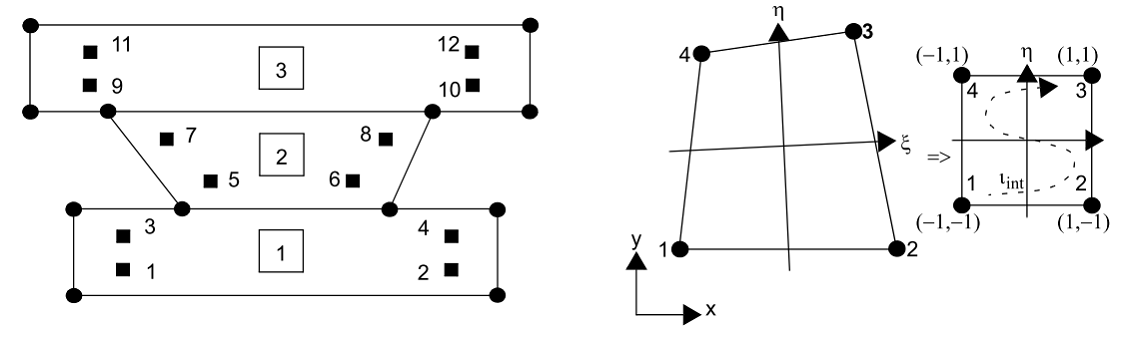 Figure above shows a general solid section constituting of three quadrilateral segments using a 2 x 2 Gauss integration scheme. It also shows the numbering conventions adopted in a quadrilateral segment and its mapping onto the parametric space. For each segment in the example, the first corner point is the lower-left corner and the corner points have been entered in a counterclockwise sense. The segment numbers and the resulting numbering of the integration points are shown in the figure. Gauss integration schemes do not provide integration points in the corner points of the section. Other integration schemes like Simpson or Newton-Cotes schemes exist.