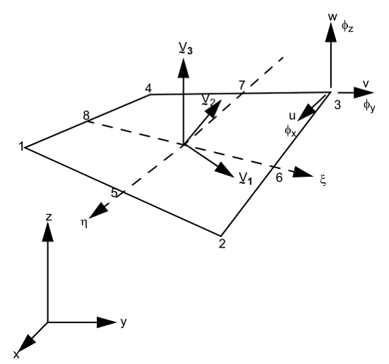 The element is defined geometrically by the (x, y, z) coordinates of the four corner nodes and four midside nodes. The element thickness is specified in the structural element. The stress output is given with respect to local orthogonal surface directions