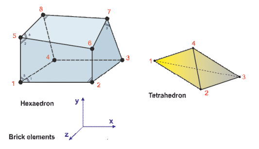 Reduction to Wedge or Tetrahedron: by simply repeating node numbers on the same spatial position, the element can be reduced as far as a tetrahedron. 10-node tetrahedron is preferred in this case.