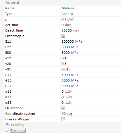 CivilFEM allows the definition of an orthotropic generic material, giving the user control over all orthotropic parameters. If the orientation box is left unchecked, the material properties are oriented to the Global Cartesian axes. The user can define a new coordinate system and assing it to the material as shown in the figure below. This option grants total control over the material orientation, as a general new coordinate system can be created.