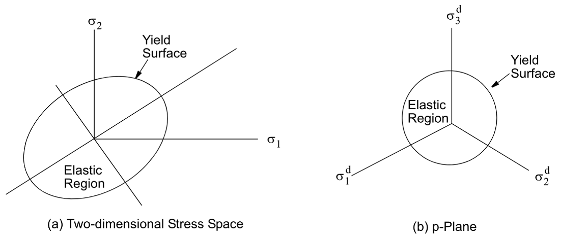 Figure below shows the von Mises yield surface in two-dimensional and three-dimensional stress space.