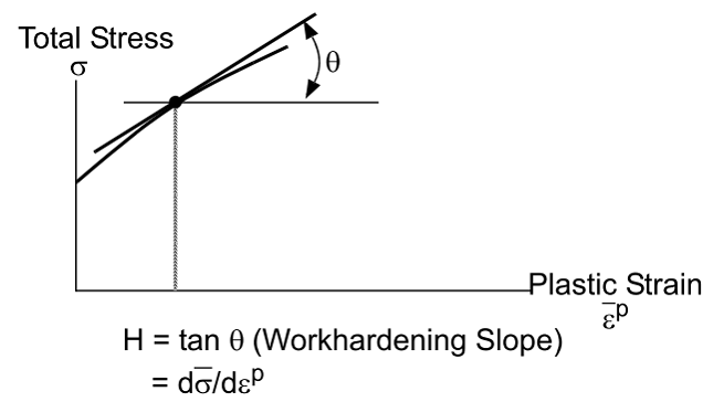 The uniaxial stress-strain curve is usually plotted for total quantities (total stress versus total strain). The total stress-strain curve can be replotted as a total stress versus plastic strain curve, as shown in the next figure which shows the definition of workhardening slope (Uniaxial Test). The slope of the total stress versus plastic strain curve is defined as the workhardening slope (H) of the material. The workhardening slope is a function of plastic strain.