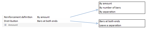 The reinforcement definition may be done by amount, number of bars or by separation.