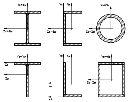 CivilFEM uses two coordinate systems in beam sections: the CivilFEM axis system (XCF, YCF, ZCF) and the section axes system (XS, YS, ZS).