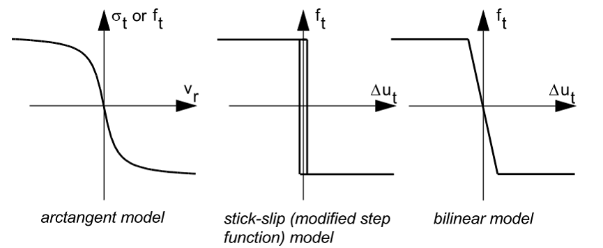 Since this discontinuity in the friction value may easily cause numerical difficulties, different approximations of the step function have been implemented. They are graphically represented in figure below and bilinear model will be discussed as is the one available in CivilFEM.