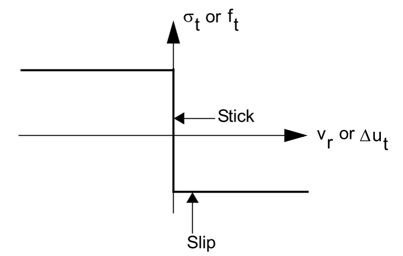 For a given normal stress or normal force, the friction stress or force has a step function behavior based upon the value of the relative sliding velocity
