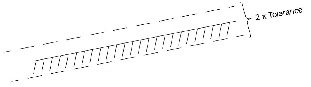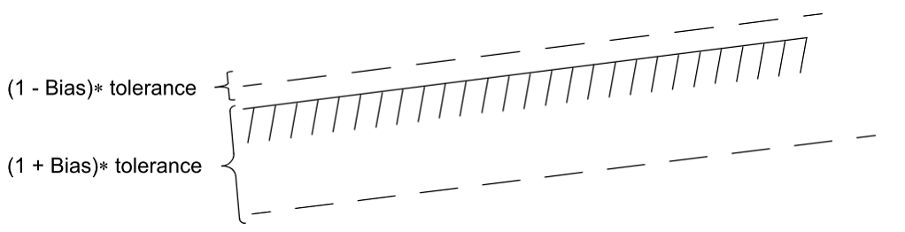 Many times, areas exist in the model where nodes are almost touching a surface (for example, in rolling analysis close to the entry and exit of the rolls). In such cases, the use of a biased tolerance area with a smaller distance on the outside and a larger distance on the inside is advised. This avoids the close nodes from coming into contact and separating again and is accomplished by entering a bias factor. The bias factor should be given a value between 0.0 and 0.99. The default is 0.0 or no bias. Also, in analyses involving frictional contact, a bias factor for the contact tolerance is recommended. The outside contact area is (1. - bias) times the contact tolerance on the inside contact area (1. + bias) times the contact tolerance (see figure below). The bias factor recommended value is 0.95.