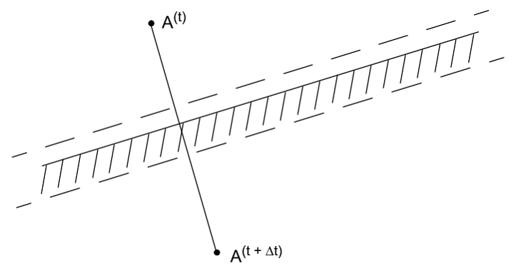 During an increment, if node A moves from A (t) to A (t+Δt), where A (t+Δt) is beyond the contact tolerance, the node is considered to have penetrated (see figure below). In such a case, a special procedure is invoked to avoid this penetration.