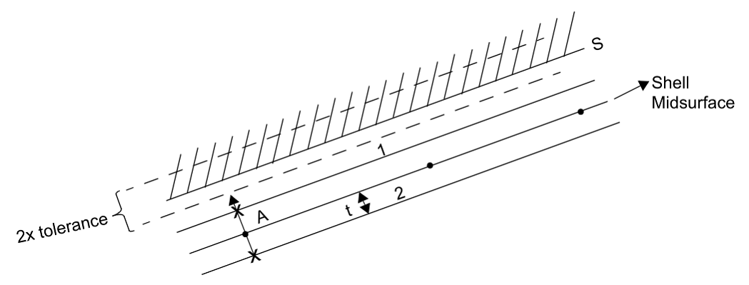 If point x or y falls within the contact tolerance distance of segment S, node A is considered in contact with the segment S. Here x1 and x2 are the position vectors of a point on the surfaces 1 and 2 on the shell, A is the position vector of a point (node in a discretized model) on the midsurface of the shell, is the normal to the midsurface, and is the shell thickness.