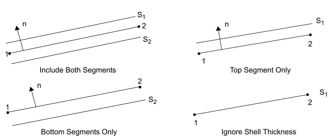 As the shell has finite thickness, the node (depending on the direction of motion) can physically contact either the top surface, bottom surface, or mathematically contact can be based upon the midsurface. You can control whether detection occurs with either both surfaces, the top surface, the bottom surface, or the middle surface. In such cases, either two or one segment will be created at the appropriate physical location. Note that these segments will be dependent, not only on the motion of the shell, but also the current shell thickness (see figure below).