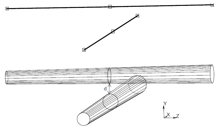 Contact is detected between two beams or truss elements if the associated conical surfaces touch each other; that is, if the distance between the closest points on the conical surfaces is smaller than the distance below which bodies are considered touching each other. This is shown in the figure below where beam elements and their contact body representation are given. It should be emphasized that the contacting points are points on the conical surfaces and not nodes of the finite element model.