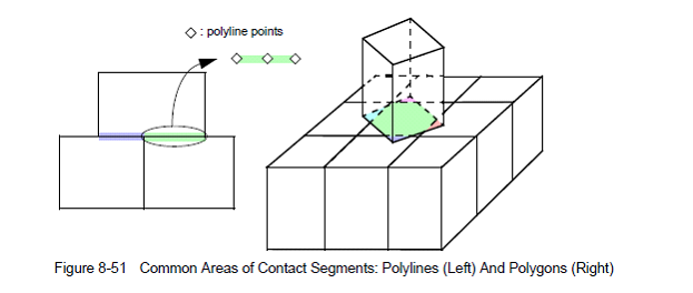 If both checks are passed, the segments are marked as potentially contacting. For each segment-segment combination within contact distance, polygons (polylines in 2D) will be generated element wise. Each polygon has a number of polygon points. These Polyline points does not coincide with the auxiliary points used of the contact detection before. In the same way as for the auxiliary points before, a second contact detection pass is performed for the polygon points (distance + direction check). At the end of this second pass, there is a set of polygon points being in contact and representing the contact area. The polygons can be treated as normal interface elements representing the contact stiffness. The polygon points build the basis for the numerical integration of the corresponding contact stiffness formulation