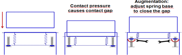 In case that too large penetration occurs, the augmentation procedure may be used to iteratively adjust the contact normal stress so that the overlap of the contact bodies will be minimized. Augmentation means that a gap function g defined by the contact gap (g=0 when gap is closed) will be minimized iteratively by adjusting the contact normal stresses p. The augmentation procedure (adjustment of the spring base) forces additional recycles in the global Newton-Raphson algorithm.