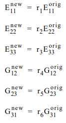 This is done differently for different failure criteria as described below. Six such reduction factors are stored and updated. They are then used for scaling the respective material modulus according to: