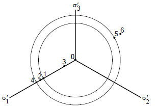 The specimen is loaded in the following order: from stress free (point 0) to initial yield (point 1), 2 (loading), 3 (unloading), 2 (reloading), 4 (loading), 5 and 6 (unloading). As in isotropic hardening, stress at 1 is equal to the initial yield stress
