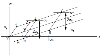 , due to work hardening. Point 3 is elastic, and reverse yield takes place at point 5. Under the kinematic hardening rule, the reverse yield occurs at the level of